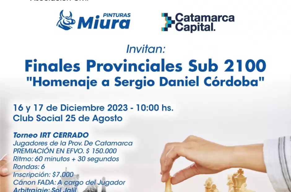 Organizado por la Asociación Catamarca Ajedrez se jugará, en el Club Social 25 de Agosto, el último torneo del año, que será Valido al ELO Standard FIDE (Federación Internacional de Ajedrez), el próximo 16 y 17 de diciembre; y será destinado a jugadores que residen en el provincia de Catamarca.