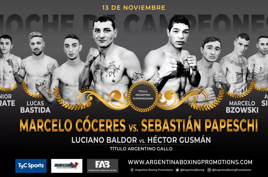 El boxeo argentino continúa con todo en una noche repleta de campeones y grandes nombres de la mano de Argentina Boxing Promotions por TyC Sports. El ex múltiple campeón latino y retador mundialista entrerriano Marcelo “El Terrible” Cóceres se enfrentará al ex monarca sudamericano bonaerense Sebastián “La Promesa” Papeschi, en disputa del título argentino supermediano interino, en uno de los combates estelares de la velada que se desarrollará este viernes, 13 de noviembre, en el Complejo Deportivo del Club Atlético, Social y Deportivo Camioneros, sito en Ruta de la Tradición 6300, Luis Guillón, provincia de Buenos Aires, Argentina, en una nueva producción de Argentina Boxing Promotions, de Mario Margossian, que será transmitida en vivo a través de TyC Sports a partir de las 23:30, para Argentina y toda América.