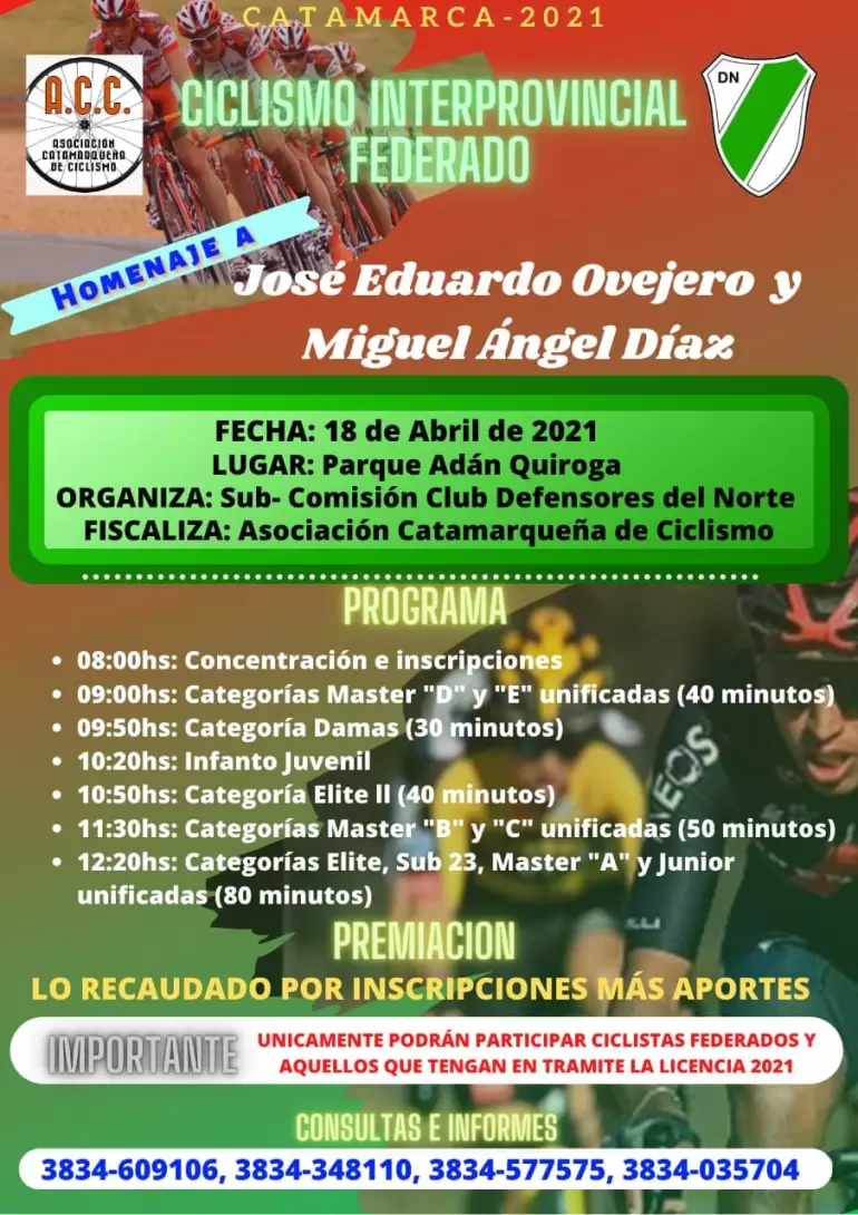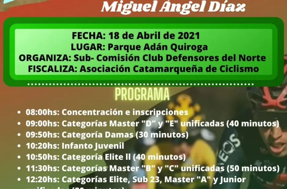 La Subomisión de Ciclismo del Club del Club Defensores del Norte tiene prevista una competencia ciclística para el 18 de abril en el óvalo del Parque Adán Quiroga. La misma será fiscalizada por la Asociación Catamarqueña de Ciclismo.