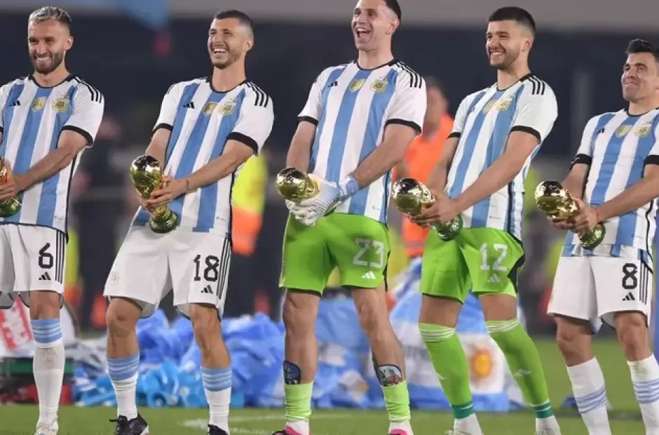 El arquero campeón del mundo, acompañado por Gerónimo Rulli, Marcos Acuña, Germán Pezzella y Guido Rodríguez, lideró el ya festejo “sexual” que se hizo viral desde la Copa América. Los jugadores agarraron una Copa del Mundo cada uno y repitieron el gesto.