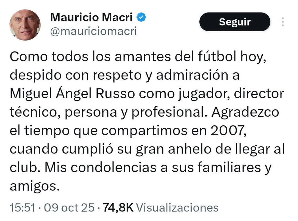 "Agradezco el tiempo que compartimos en 2007, cuando cumplió su gran anhelo de llegar al club. Mis condolencias a sus familiares y amigos", cerro Mauricio Macri su posteo sobre la partida de Miguel Ángel Russo.