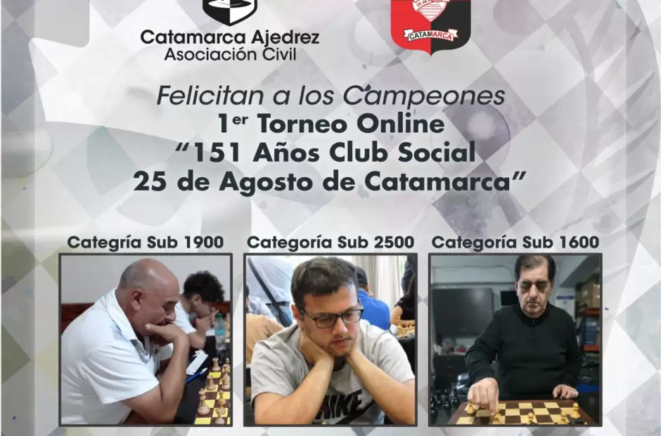 El pasado sábado 6 de junio, se realizó la 4ta fecha del Torneo “151 Años del Club Social 25 de Agosto de la ciudad de Catamarca, con la característica de ser virtual online. Cabe resaltar, que el ganador fue el Maestro Internacional, Raúl Claverie quien se quedó con el primer lugar de las 4 fechas disputadas. El segundo lugar fue para el Maestro FIDE, Alessandro Manzaro Barranco de la provincia de Chaco; mientras que el mejor catamarqueño de la competencia fue Kevin Salgado de Laguna Blanca, departamento Belén; quien se quedó con el 3er lugar de la fecha. Cabe señalar, que la competencia se desarrolló en la Plataforma de juegos Lichess.org.