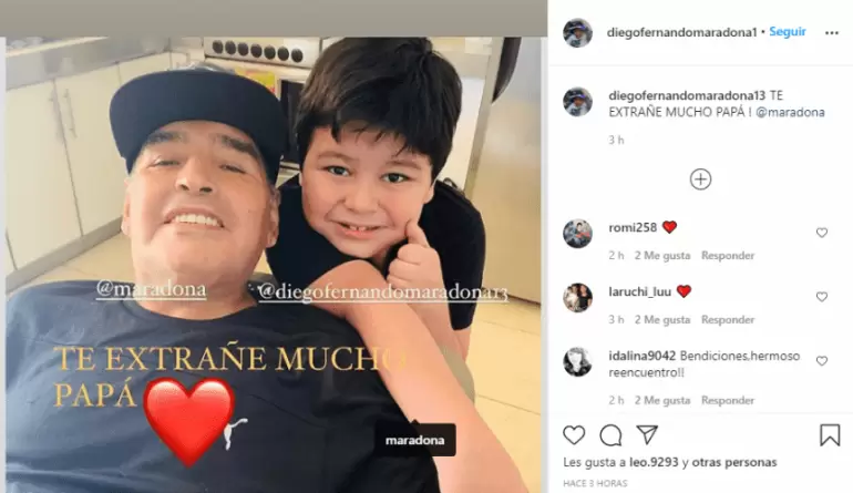Dieguito Fernando, el menor de los Maradona producto de la larga relación de Diego con Verónica Ojeda, compartió este jueves en su cuenta de Instagram una linda imagen con su padre. "TE EXTRAÑE MUCHO PAPÁ !", se puede leer en la cuenta con más de doce mil seguidores del niño de solo siete años junto a una foto de los dos sonriendo juntos.