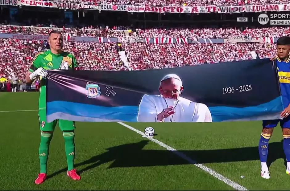 Antes de que sonara el pitazo inicial en el Monumental, los jugadores de River Plate y Boca Juniors se unieron en un reconocimiento al Papa Francisco. Franco Armani y Marcos Rojo fueron los encargados de sostener una bandera con la imagen de Jorge Bergoglio, mientras que el resto de los futbolistas acompañó el acto con un prolongado y respetuoso aplauso.