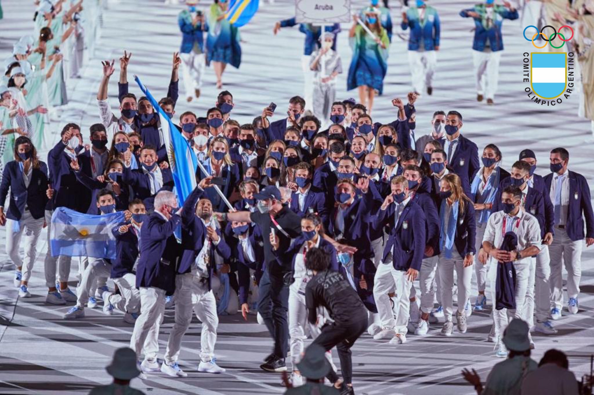 La delegación argentina, encabezada por los abanderados regatistas Santiago Lange y Cecilia Carranza Saroli quienes ganaron la presea dorada en Vela en Rio de Janiero 2016, desfiló hoy con entusiasmo en el Estadio Nacional de Tokio en la ceremonia Inaugural de los Juegos Olímpicos, evento que se realiza sin público para mitigar los efectos de la pandemia de coronavirus.