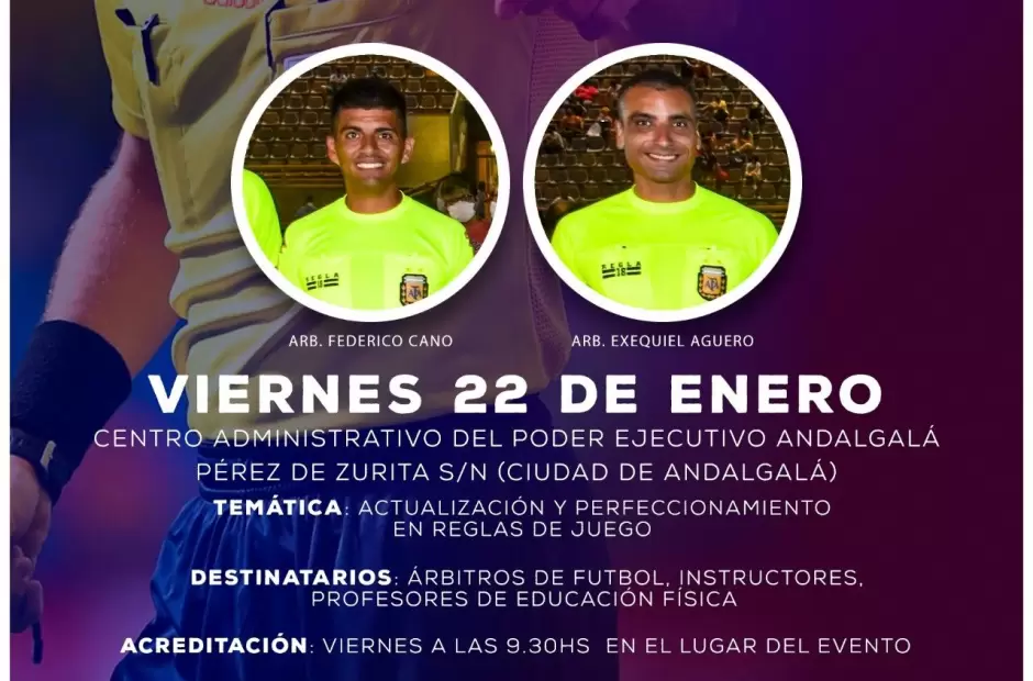 Este viernes 22, en el Centro Administrativo del Poder Ejecutivo de Andalgalá se dictará un curso de arbitraje de fútbol con la organización de la Dirección Provincial de Capacitación de la Secretaría de Deportes y Recreación en conjunto con la Cooperativa de Árbitros Independientes de Catamarca, y el apoyo del Senador por Andalgalá Horacio Gutiérrez. Los disertantes son los árbitros Federico Cano y Exequiel Agüero y las inscripciones se realizarán en el lugar desde las 9.30 hs.