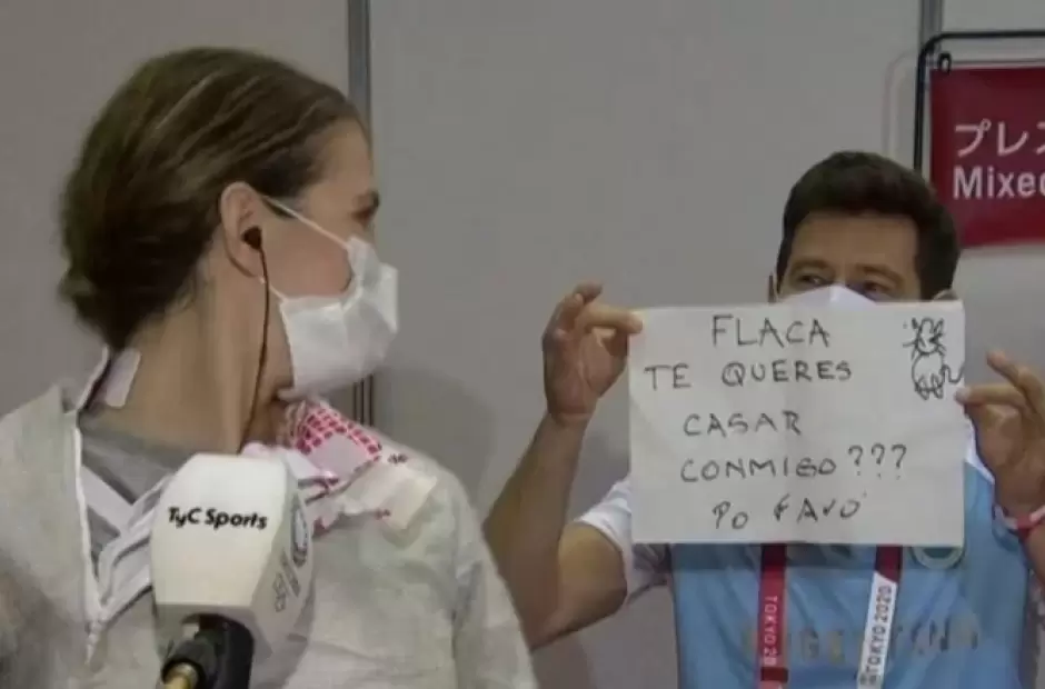 De la contrariedad por la derrota pasó a la emoción con lágrimas en el rostro cuando su pareja, el maestro de esgrima Saucedo, apareció detrás de ella y frente a las cámaras de televisión con un cartel manuscrito que proponía: "Flaca, ¿te querés casar conmigo? Por favor".