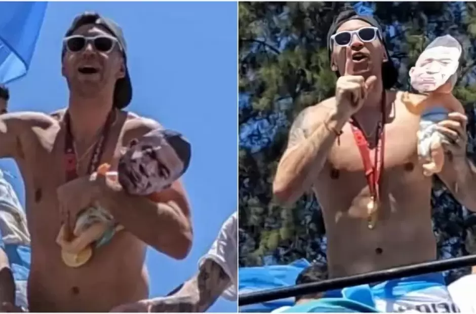 Por ese motivo las fotos del festejo de Dibu en la caravana se hicieron virales: no solo porque logró “hacerle upa” a un bebé, sino también porque en el muñeco estaba la cara de Mbappé.