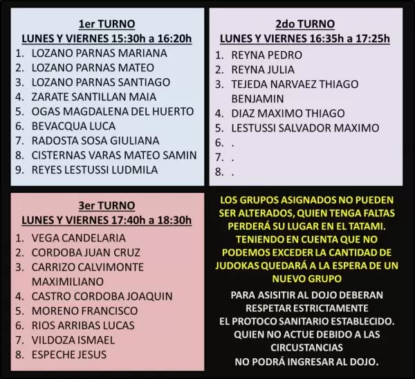 Entre algunos puntos del reglamento, los alumnos deberán asistir con su Dujogi puesto o caso contrario llevarlo en una mochila y cambiarse en su lugar asignado. También, el uso de barbijo es obligatorio. Los padres deberán llenar una declaración jurada antes de entrar. Los baños no podrán ser utilizados sólo en caso de extrema urgencia.