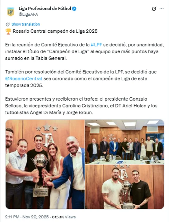 "También por resolución del Comité Ejecutivo de la LPF, se decidió que Rosario Central sea coronado como el campeón de Liga de esta temporada 2025. Estuvieron presentes y recibieron el trofeo: el presidente Gonzalo Belloso, la vicepresidenta Carolina Cristinziano, el DT Ariel Holan y los futbolistas Ángel Di María y Jorge Broun".