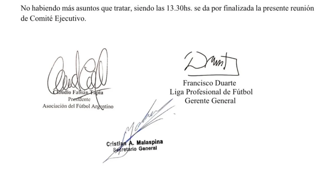 Poco después de la confirmación de la nueva estrella para los "Canallas" se publicó el acta oficial que da cuenta de la reunión mencionada, la cual contó con la firma al pie del mencionado Tapia, el gerente general de la Liga Profesional de Fútbol (LPF) Francisco Duarte y el secretario general de AFA, Cristian Malaspina.