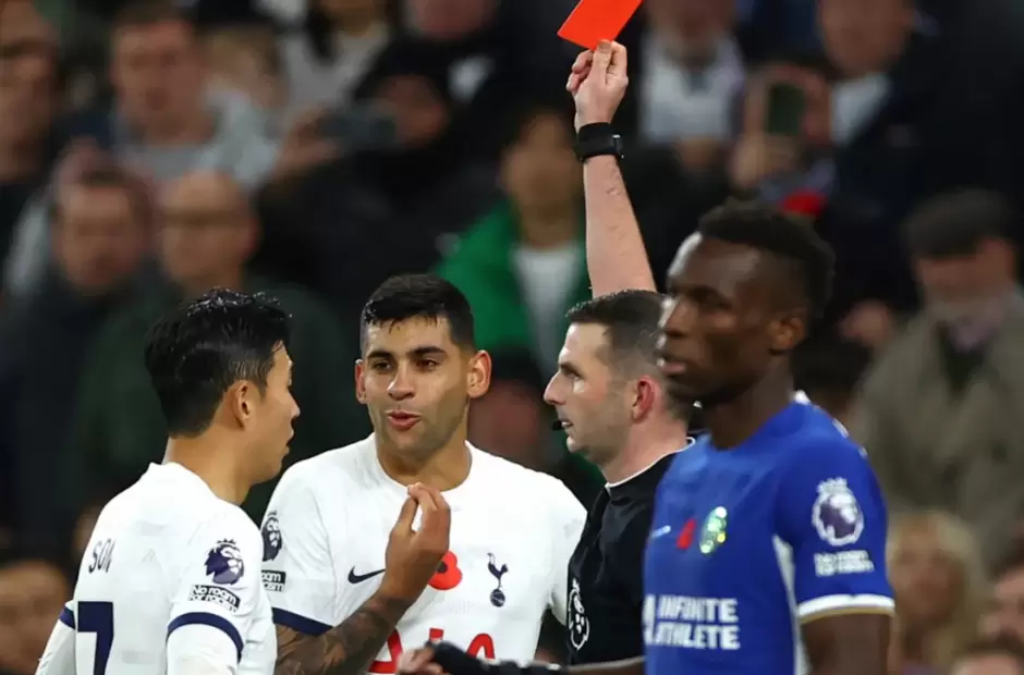 A los 32 minutos del encuentro entre Tottenham y Chelsea por la fecha 11 de la Premier League, Cristian Romero cambió el rumbo del partido. El defensor de la Selección argentina, en su afán por rechazar, se llevó puesto el tobillo izquierdo de Enzo Fernández dentro del área de su equipo. Tras revisar la jugada en el VAR, el árbitro decidió sancionar el penal y mostrarle la roja al Cuti.