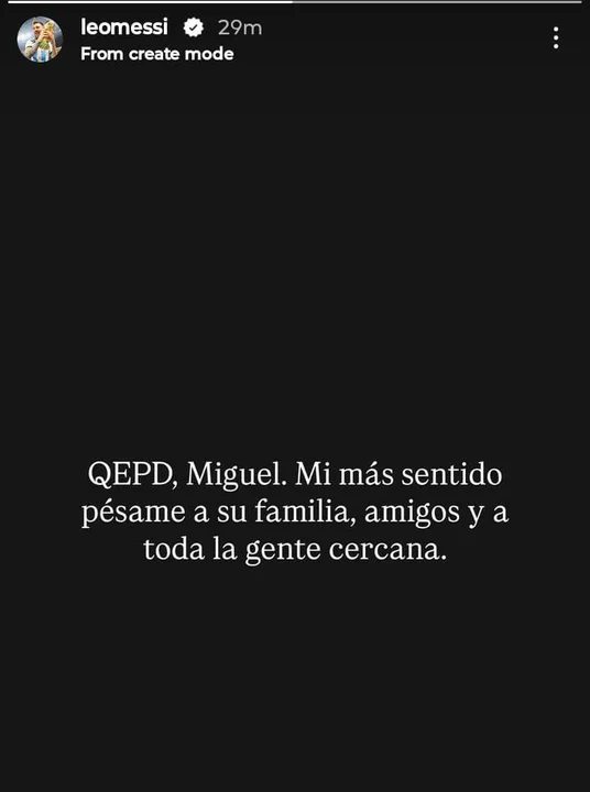 "QEPD, Miguel. Mi más sentido pésame a su familia, amigos y a toda la gente cercana", escribió el astro argentino en una historia de su cuenta personal de Instagram.