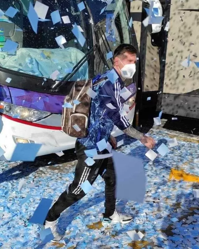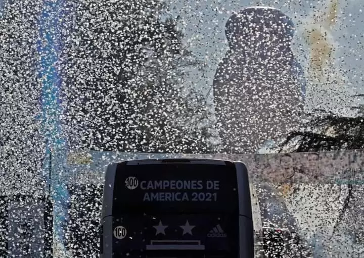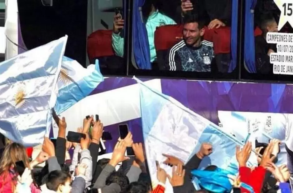 Los campeones llegaron en un par de micros ploteados con la leyenda "campeones de América". Además, también se puede ver una estrella con el número 15 en el centro que hace referencia a la cantidad de Copas Américas logradas por la Selección nacional.