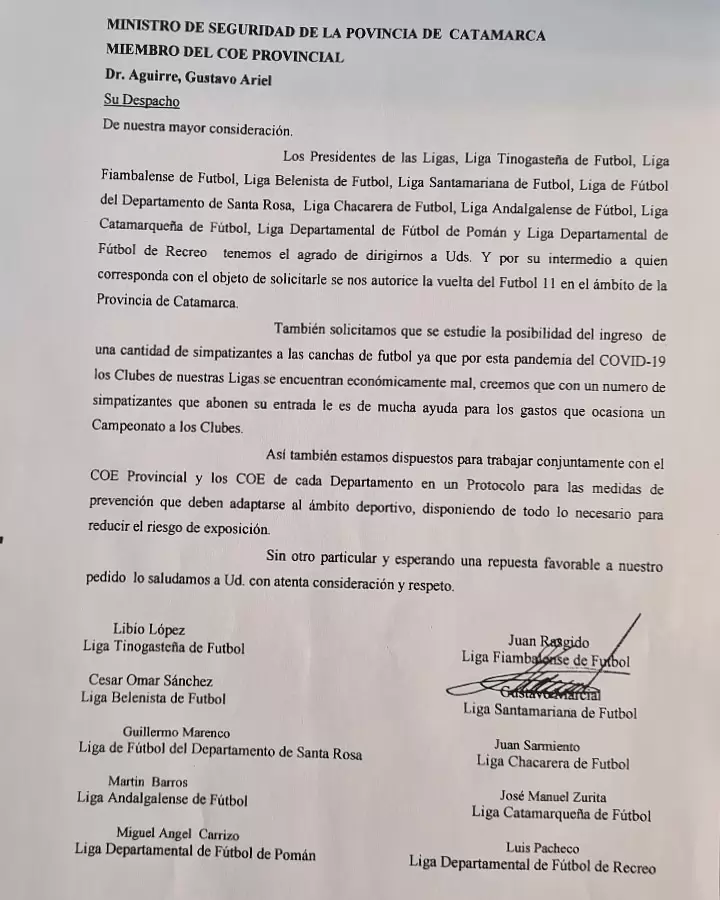 Vale mencionar que dicho pedido lleva la firma de cada uno de los presidentes de las Ligas de Fútbol , Liga Catamarqueña, Liga Belenista, Liga Tinogasteña, Liga Fiambalense , Liga Chacarera, Liga Santamariana, Liga Santarroseña, Liga Andalgalense, Liga Recreína y Liga Departamental de Fútbol de Pomán.