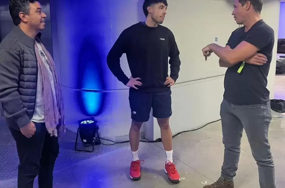 Una imagen capturada por la Asociación de Pádel Argentino (APA) muestra a Marcelo Gallardo junto al empresario Jorge Brito y al catamarqueño Agustín Tapia, uno de los finalistas del torneo.