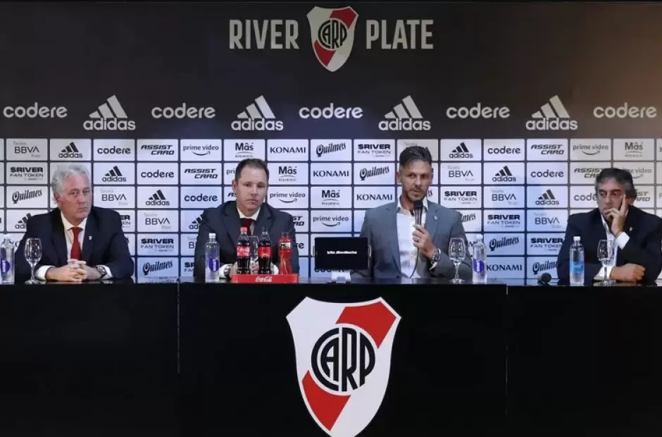 El flamante entrenador de River se presentó en el Monumental para dar sus primeras palabras acompañado del presidente del club, Jorge Brito, el vicepresidente, Matías Patanián, y el secretario técnico, Enzo Francescoli.