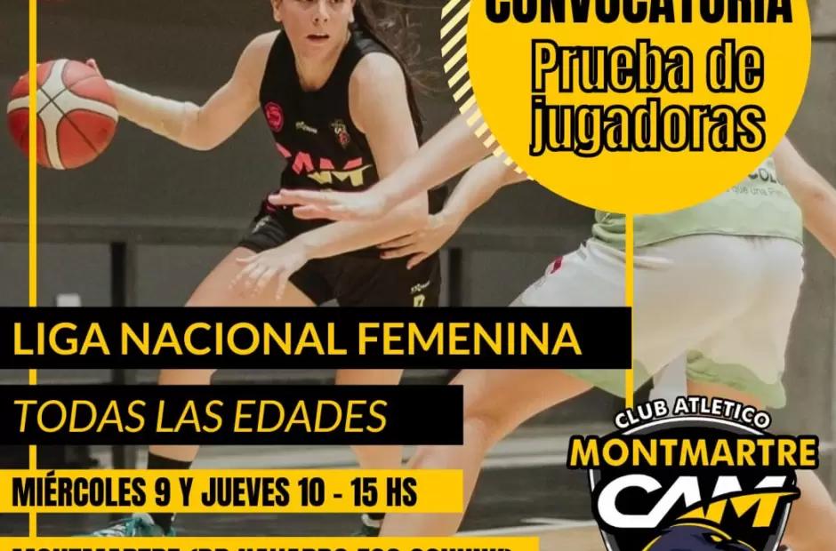 En el marco de su participación para la temporada 2024/25 de la Liga Nacional Femenina de Básquetbol, el Club Atlético Montmartre realizará una prueba abierta para jugadoras este miércoles y jueves a las 15 hs, en su cancha, ubicada en Dr. Navarro esquina Schunk, en el Barrio Achachay.