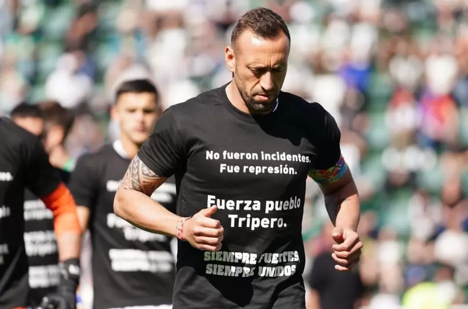 “No fueron incidentes, fue represión. Fuerza, pueblo Tripero. Siempre fuertes, siempre unidos”, pudo leerse en la indumentaria que lucieron los jugadores de la visita al salir al campo de juego y con la que también posaron para la foto previa a cada cotejo.
