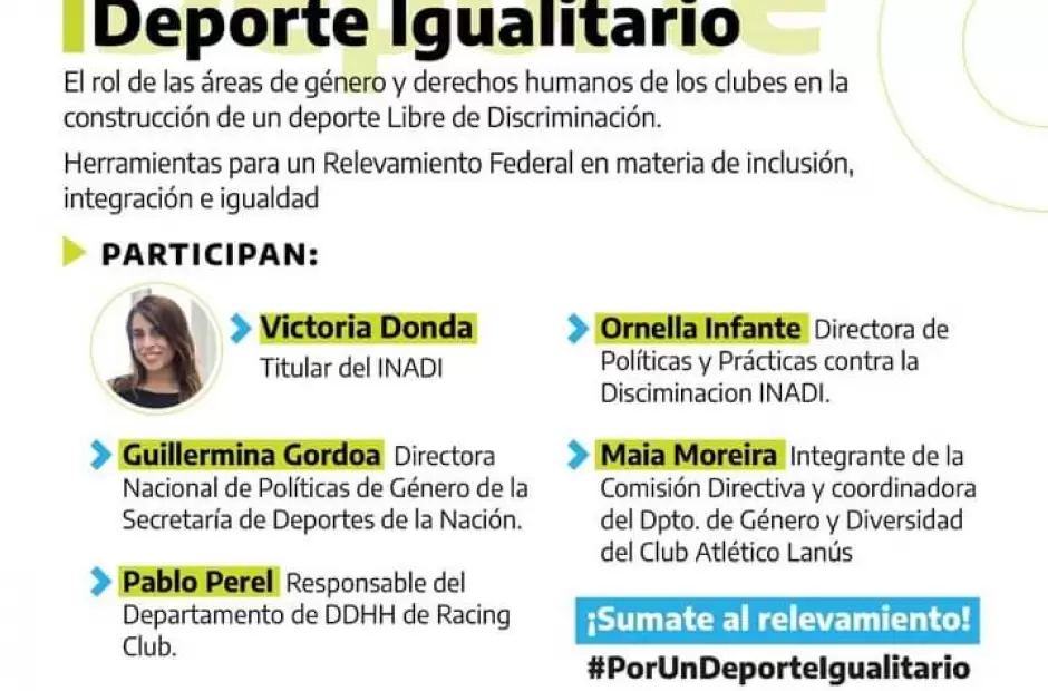 El encuentro virtual tendrá el nombre de Construir un Deporte Igualitario, donde se trabajará sobre el rol de las áreas de género y derechos humanos de los clubes en la construcción de un deporte libre de discriminación, con la participación de la titular del INADI Victoria Donda, la Directora de Políticas y Prácticas contra la Discriminación INADI Ornella Infante, la Directora Nacional de Políticas de Género de la Secretaría de Deportes de la Nación Guillermina Gordoa, la integrante de la Comisión Directiva y Coordinadora del Departamento de Género y Diversidad del Club Atlético Lanús Maia Moreira y el responsable del Departamento de Derechos Humanos de Racing Club Pablo Perel.