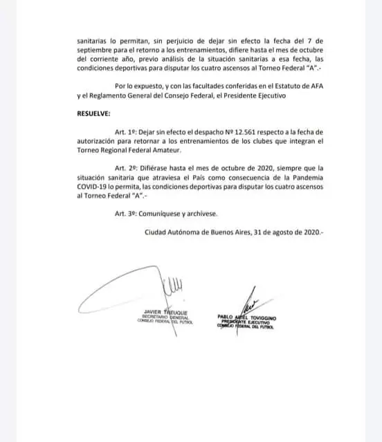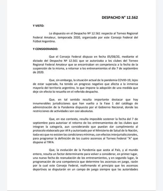 Art. 1: Dejar sin efecto el Despacho N° 12.561 respecto a la fecha de autorización para retornar a los entrenamientos de los clubes que integran el Torneo Regional Federal Amateur.