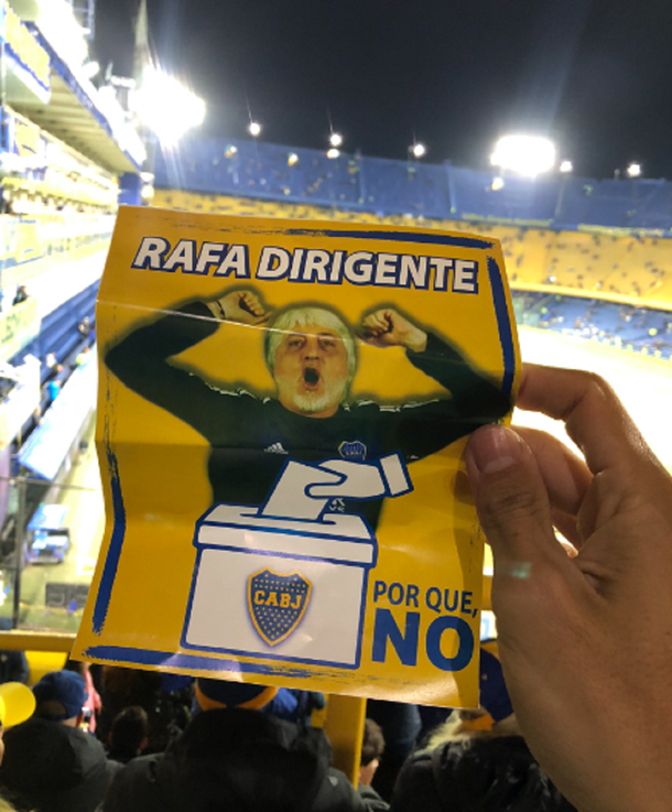La Doce repartió papeles en La Bombonera proponiendo su candidatura. "Por que, no", dice el folleto con la imagen del barrabrava junto a una urna.