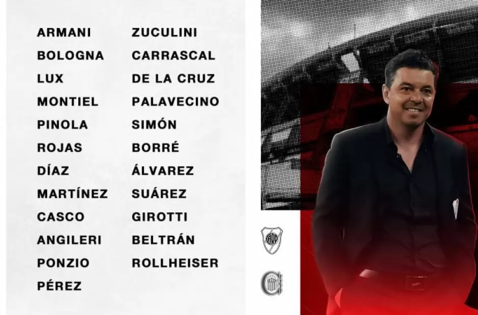 Marcelo Gallardo decidió citar a Franco Armani, Enrique Bologna, Gemrán Lux, Gonzalo Montiel, Javier Pinola, Robert Rojas, Paulo Díaz, Héctor David Martínez, Milton Casco, Fabrizio Angileri, Leonardo Ponzio, Enzo Pérez, Bruno Zuculini, Jorge Carrascal, Nicolás De La Cruz, Agustín Palavecino, Santiago Simón, Rafael Santos Borré, Julián Álvarez, Matías Suárez, Federico Girotti, Lucas Beltrán y Benjamín Rollheiser.