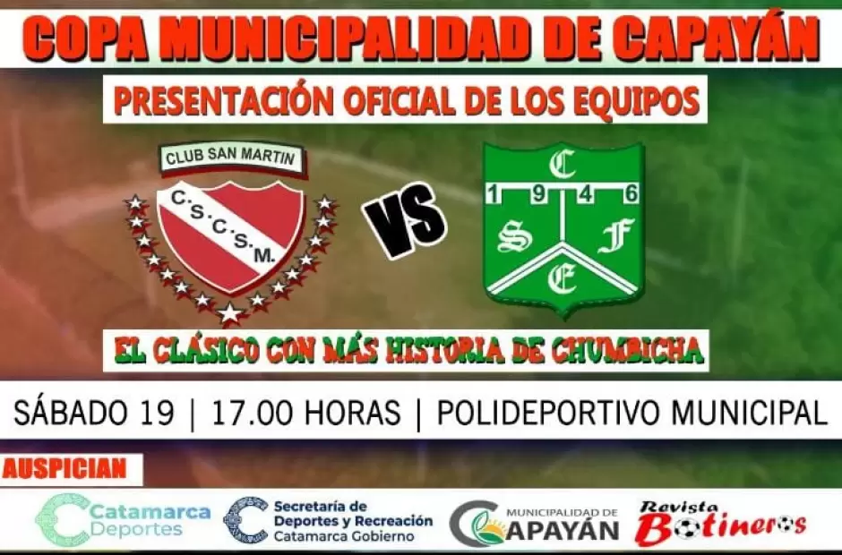 En el Polideportivo Municipal será la cita en la cancha "Nicolás Romero" donde se pondrá en juego la Copa "Municipalidad de Capayán". Los equipos se estarán presentando en sociedad de cara a la competencia oficial de la Liga Catamarqueña.