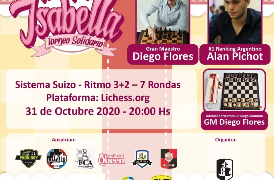 Este sábado 31 de octubre, desde las 20 horas, la Asociación Catamarca Ajedrez dará inicio al 6to Torneo Online “Todos por Isabella- Torneo Solidario.El evento, tendrá nuevamente la participación del Gran Maestro Internacional Diego Flores y del número 1 del ranking argentino, GM Alan Pichot, además, de jugadores de gran nivel. La competencia se realizará a través de la plataforma: Lichess.org.; será fiscalizada por la Asociación Catamarca Ajedrez y estará a cargo por el director del torneo el Prof. Carlos Amaya.