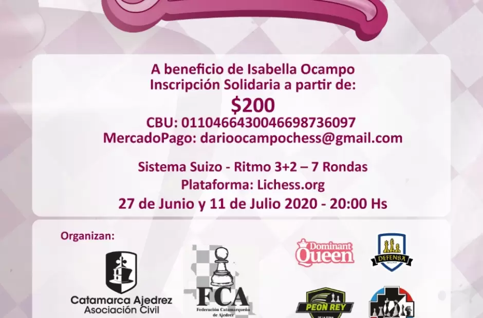 Como es de público conocimiento ISABELLA OCAMPO, hijita menor de nuestro querido amigo y ajedrecista CATAMARQUEÑO DARIO OCAMPO está Internada en el Hospital Garrahan de la Ciudad Autónoma de Buenos Aires. Fue trasladada de urgencia por una complicación de Salud. Los Gastos que se deben cubrir tanto el PAPÁ como la MAMÁ son muy caros y por este motivo estamos haciendo este TORNEO SOLIDARIO, La idea es que si sos AJEDRECISTA ARGENTINO y sos PAPÁ sepas que hay un colega (excelente ser humano) que hoy está atravesando una NECESIDAD MUY IMPORTANTE y queremos que nos acompañes, que nos ayudes a ayudar, que compartas esta publicación siempre buscando un alma y un Corazón Solidario.