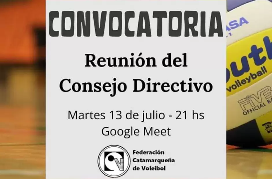 Este próximo martes 13 a las 21 hs, a través de la plataforma Google Meet, se realizará una reunión del Consejo Directivo de la Federación Catamarqueña de Voleibol con la participación de los delegados de todas las entidades afiliadas de la provincia.