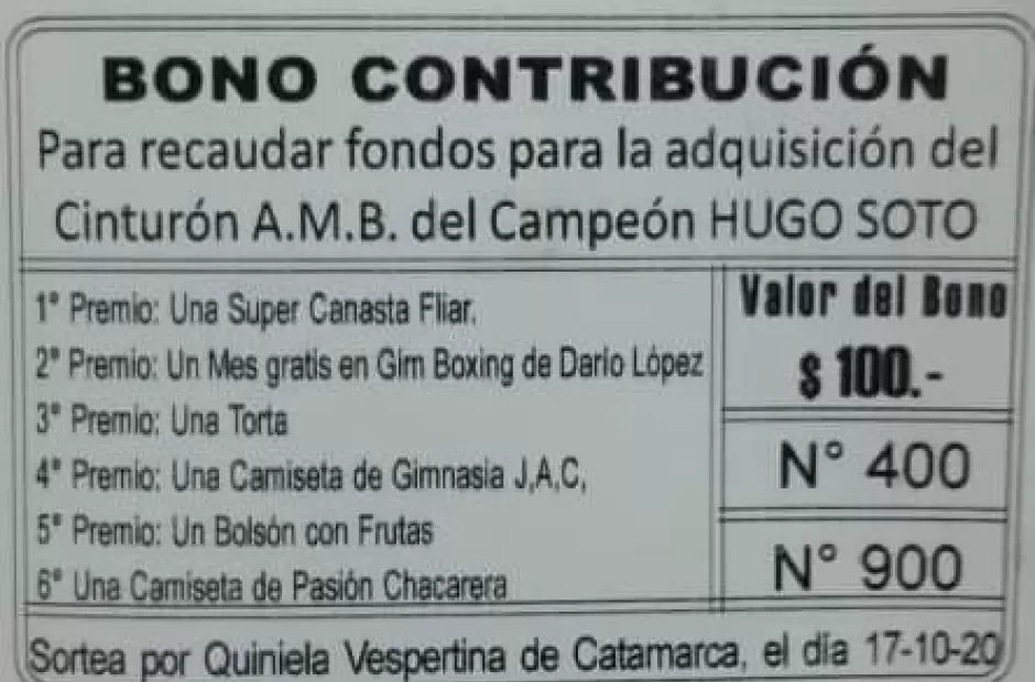 La Agrupación de Técnicos y Boxeadores Catamarqueños (ADTYC) puso en circulación el bono contribución, que tendrá como objetivo la compra del cinturón que lo acredite como campeón Mundial de la categoría Mosca (50,802Kg.) al catamarqueño Hugo Rafael Soto.