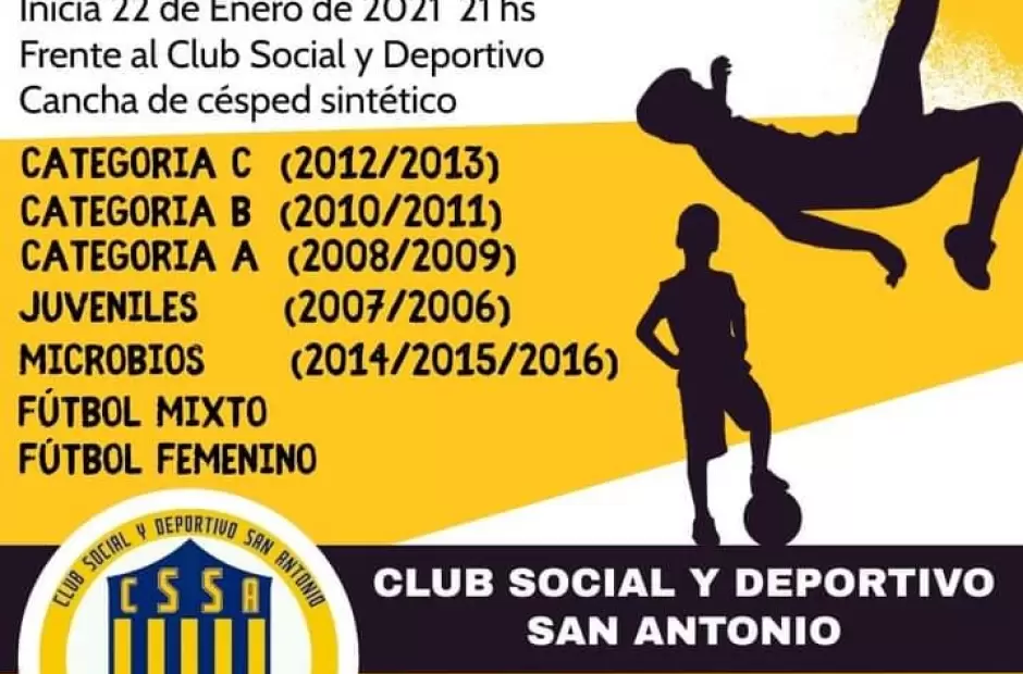 Desde el Club Social San Antonio informaron la realización del baby futbol de la institución que será para el 22 de este mes en una cancha de césped sintético. Todo comenzará desde las 21.00.