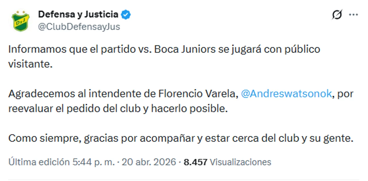 "Informamos que el partido vs Boca Juniors se jugará con público visitante. Agradecemos al intendente de Florencio Varela, Andrés Watson por reevaluar el pedido del club y hacerlo posible. Como siempre, gracias por acompañar y estar cerca del club y su gente".