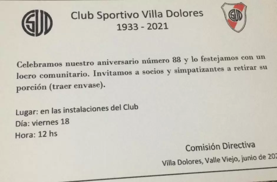 El Club Sportivo Villa Dolores festejará este viernes su aniversario número 88 y ya tiene planeado cómo lo hará. Será en su sede social ubicada en Valle Viejo.