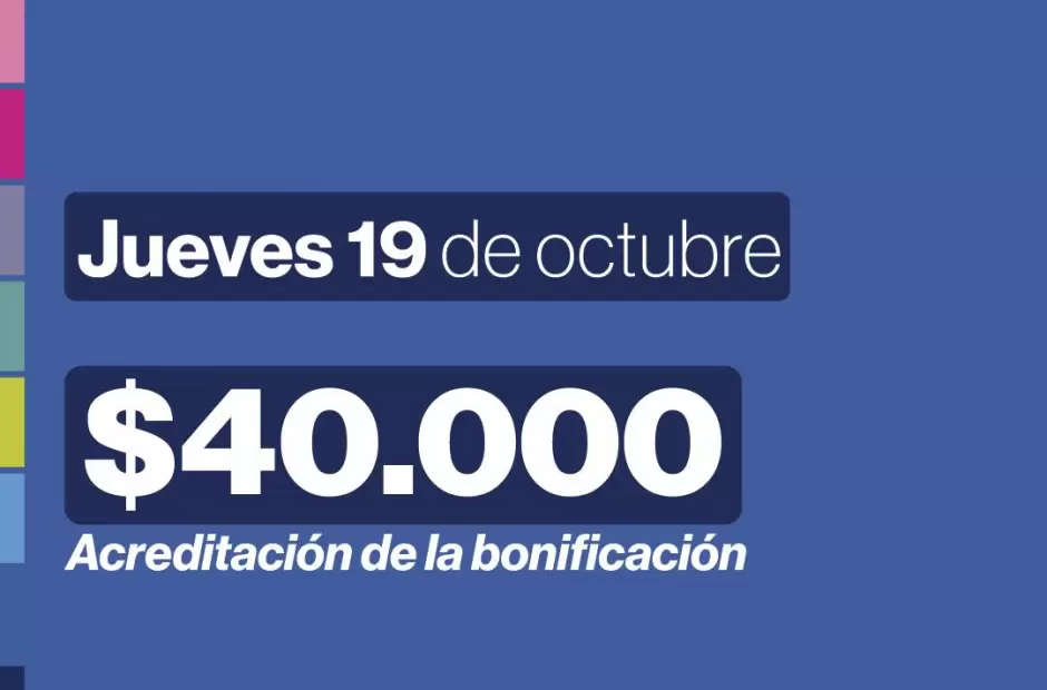 El Ministerio de Hacienda confirmó que los empleados públicos percibirán la bonificación de $40.000 este jueves 19 de octubre. Este corresponde a la 6° cuota del decreto N° 1202, más la 4° del N° 1920. Mientras que los docentes cobrarán los 20 mil pesos correspondientes a la 6 cuota.