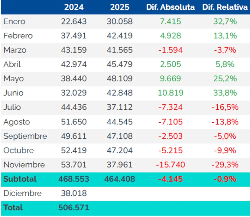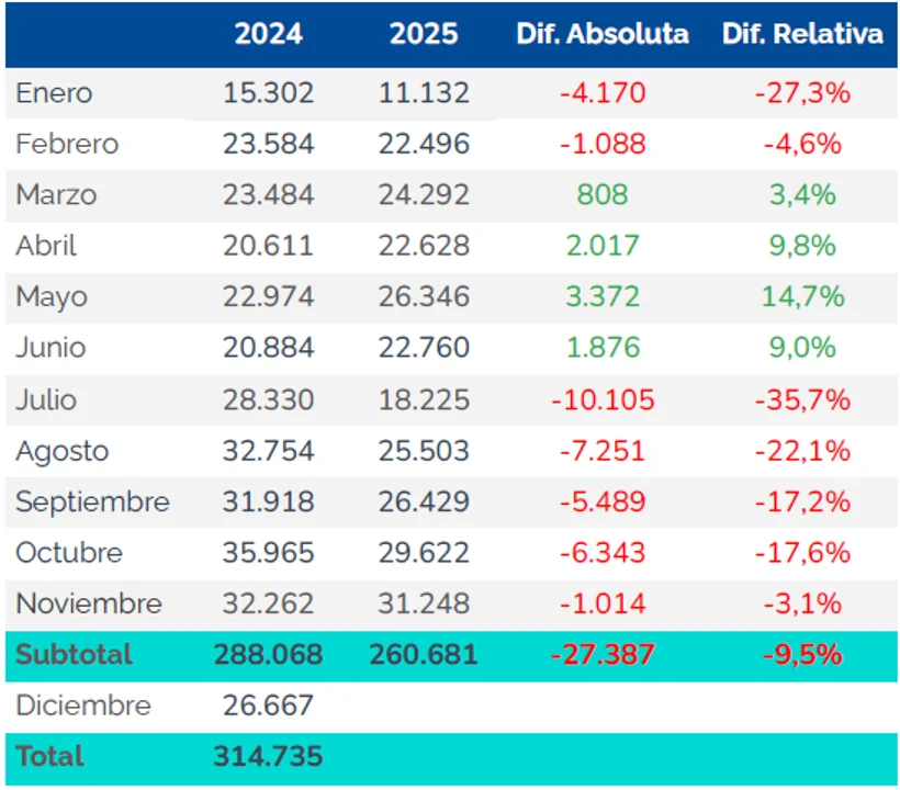 El volumen acumulado de envíos entre enero y noviembre se ubicó en 260.681 unidades, un 9,5 % menos que en 2024.