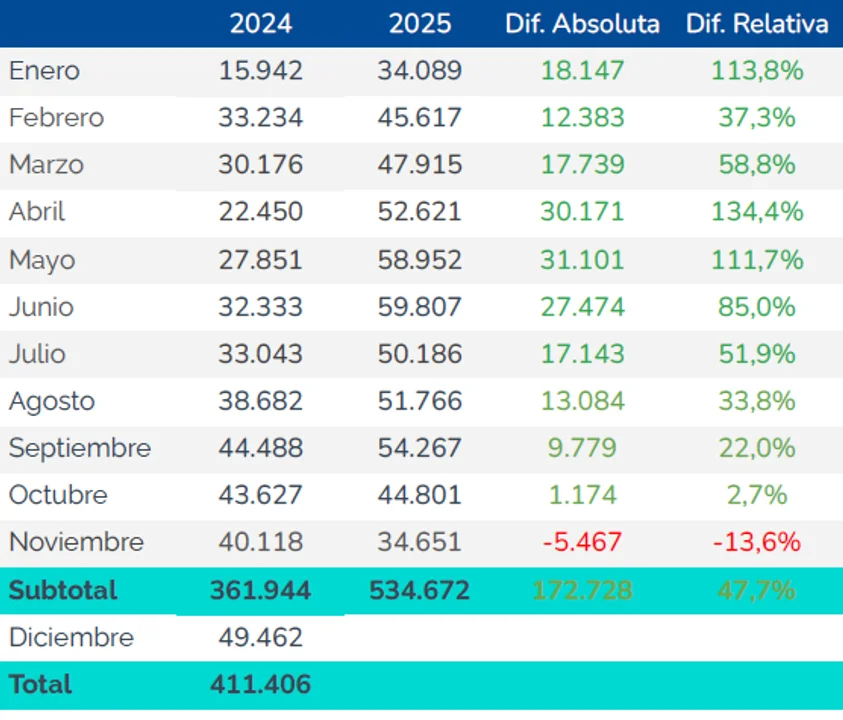 - Caída de 29,3% frente a noviembre de 2024 (53.701).