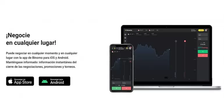 Puede descargar Binomo App para Android e iOS. Esto es posible a través de Google Play y App Store, respectivamente. Si simplemente accede al recurso a través del navegador de su teléfono o tableta, el sitio se adaptará automáticamente al tamaño de la pantalla del dispositivo.