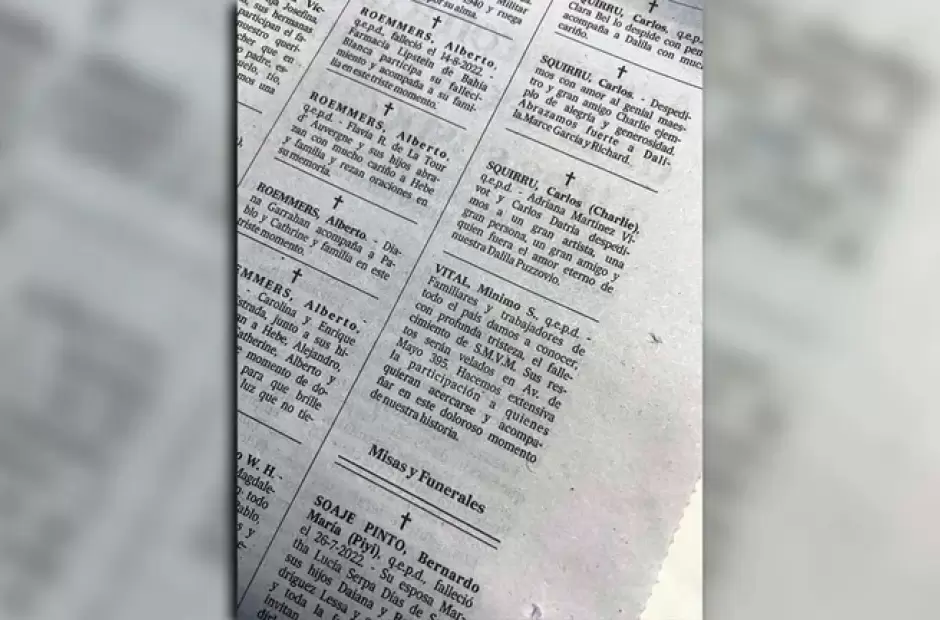 “VITAL, Minimo S. q.e.p.d. - Familiares y trabajadores de todo el país damos a conocer, con profunda tristeza, el fallecimiento de S.M.V.M. Sus restos serán velados en Av. de Mayo 395. Hacemos extensiva la participación a quienes quieran acercarse y acompañar en este doloroso momento de nuestra historia”, reza el aviso fúnebre publicado esta mañana en el diario La Nación.