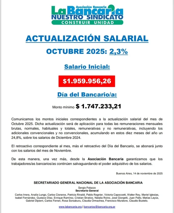 De esta manera, el nuevo aumento del gremio bancario se posiciona en paralelo con la inflación del décimo mes del año, que fue del 2,3%, y acumula un aumento de 24,8% desde enero de este año con respecto a los salarios de diciembre 2024.