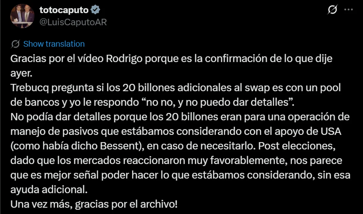 La victoria de La Libertad Avanza trajo consigo calma en los mercados. "Nos parece que es mejor señal poder hacer lo que estábamos considerando, sin esa ayuda adicional", sostuvo el funcionario.