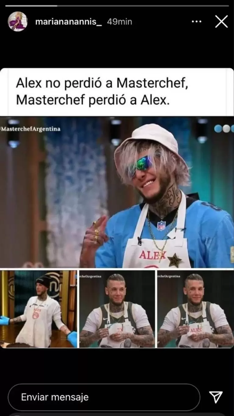 Sin embargo, lo que más captó la atención de los usuarios fue la frase con la que acompañó la historia. “Alex no perdió Masterchef, Masterchef perdió a Alex“, escribió contundente en la red social. De esta manera, criticó a la producción del reality mientras respaldaba a Alex.