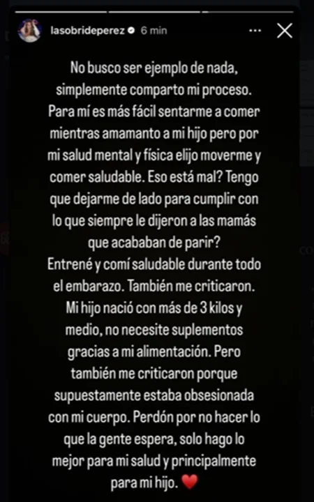"¿Tengo que dejarme de lado para cumplir con lo que siempre les dijeron a las mamás que acababan de parir? Entrené y comí saludable durante todo el embarazo. También me criticaron. Mi hijo nació con más de tres kilos y medio, no necesité suplementos gracias a mi alimentación. Pero también me criticaron porque supuestamente estaba obsesionada con mi cuerpo. Perdón por no hacer lo que la gente espera, solo hago lo mejor para mi salud y principalmente para mi hijo", concluyó.