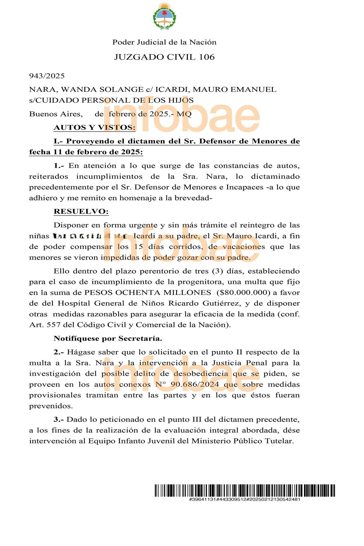 "Ello dentro del plazo perentorio de tres (3) días, estableciendo para el caso de incumplimiento de la progenitora, una multa que fijo en la suma de PESOS OCHENTA MILLONES ($80.000.000) a favor de del Hospital General de Niños Ricardo Gutiérrez, y de disponer otras medidas razonables para asegurar la eficacia de la medida (conf. Art. 557 del Código Civil y Comercial de la Nación)", solicita el documento.