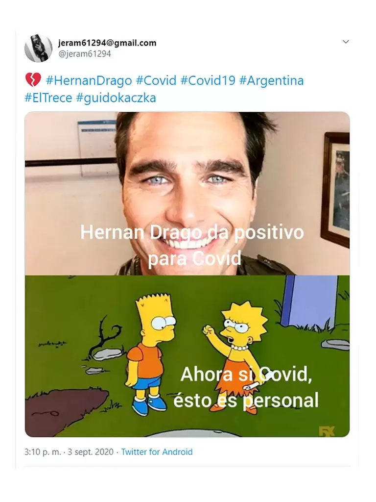 Desde que se sumó al equipo de Kaczka hace ya unos meses, Drago se convirtió en furor en las redes sociales, donde cada noche sus fans lo convierten en tendencia. Por eso, apenas se conoció la noticia de que tenía coronavirus, Twitter se llenó de mensajes desesperados de sus seguidores. Y, por supuesto, tampoco faltaron los memes de quienes, sabiendo que el modelo se sentía bien, trataron de ponerle un poco de humor a la situación a la vez que le manifestaban su apoyo.
