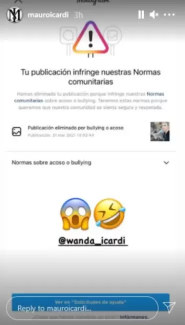Más tarde Icardi tomó una captura de un mensaje que le llegó por parte de Instagram, donde le advertían: "Publicación eliminada por bullying o acoso". La subió en una historia en su propia cuenta, en la que tiene más de seis millones y medio de seguidores.