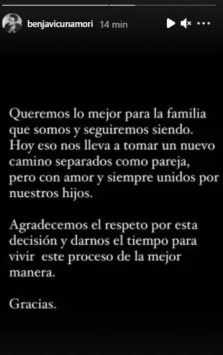 La publicación de Instagram del actor chileno dejó en shock a todo el mundo del espectáculo, ya que no suele anunciar cosas de su vida privada de esta manera. “Queremos lo mejor para la familia que somos y seguiremos siendo. Hoy eso nos lleva a tomar un nuevo camino separados como pareja, pero con amor y siempre unidos por nuestros hijos”, comenzó diciendo en el pequeño comunicado. Para cerrar el tema, pidió respeto para poder “vivir el proceso de la mejor manera”.