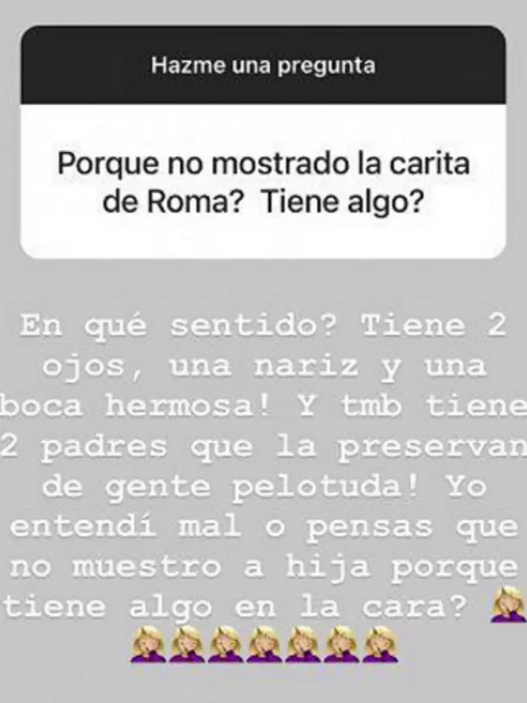 A raíz del misterio que rodea al rostro de la bebé, un usuario de Instagram aprovechó que la hermana de Gianinna abrió un espacio para dialogar con sus fans y lanzó su inquietud: “¿Por qué no mostraste la carita de Roma? ¿Tiene algo?”.