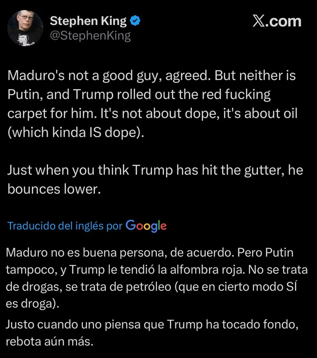 La crítica de Stephen King se inscribe en un contexto en el que Trump defendió públicamente el operativo, calificándolo como "brillante" y justificándolo, entre otros puntos, por la pérdida de intereses petroleros estadounidenses en Venezuela.